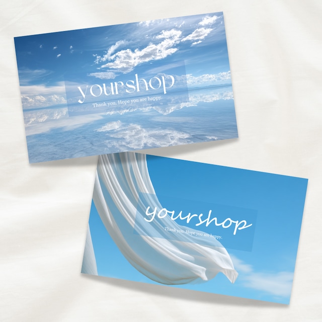 「夏の青」をテーマにした、静けさと透明感をまとったセミオーダー対応のショップカード・名刺です。 雲、空、光、風。8種類の情景からお好きなデザインをお選びいただけます。 両面印刷で、ショップ名やSNS、QRコード、メッセージなども自由にレイアウト可能です。 見るたびに心がすっと整い、やさしく涼やかな印象を残す一枚。 ブランドの世界観をそっと引き立て、初めてのご挨拶や商品に添えるカードとして活躍します。 ●こんな方におすすめ ・自然や季節感を大切にしたブランドづくりをしている作家さん ・夏の青や透明感のある空気感が好きな方 ・印象に残る名刺・ショップカードを探している方 ・名刺以外にサンクスカードや台紙としても活用したい方 ********************** ●ご注文の流れ ▽オプションで選択 おもて面デザイン 表面大文字フォント番号(フォント一覧はこちら)https://nagisadesign.theshop.jp/items/97556866 うら面レイアウト 枚数変更(必要な場合) ▽備考欄またはメッセージでご連絡 ① 表面大文字(ショップ名など) ② 表面小文字(キャッチコピーなど/省略可) ③ 裏面に入れる文字内容 ④ QRコード用URL(ご希望の場合) ▽仕上がり確認 ご入金確認後 3 営業日以内 に仕上がりイメージを送付 修正は3回まで無料(4回目以降は追加料金) ▽印刷・発送 ご承認後、国内印刷工場で印刷し 10日以内 に発送 ご注文〜発送までの目安:約14日 ********************* ●商品仕様 枚数:30枚(両面カラー印刷) サイズ:91×55 mm(一般的な名刺サイズ) 用紙:マットコート紙 0.26 mm(光の反射を抑えた艶消し仕上げ、はがき(0.22 mm)より少し厚めで高級感◎) 印刷:国内印刷工場仕上げ ●フォント選びに迷ったら 「フォントを全部見たい」という方は、オプションで 【フォント一覧打ち込み希望】 を選択してください。 ご希望のショップ名を全フォントで打ち込んだサンプル画像をお送りします。 季節の空気をまとった「夏の青」のカードで、 あなたのブランドの“世界観”を、やさしく届けてみませんか?