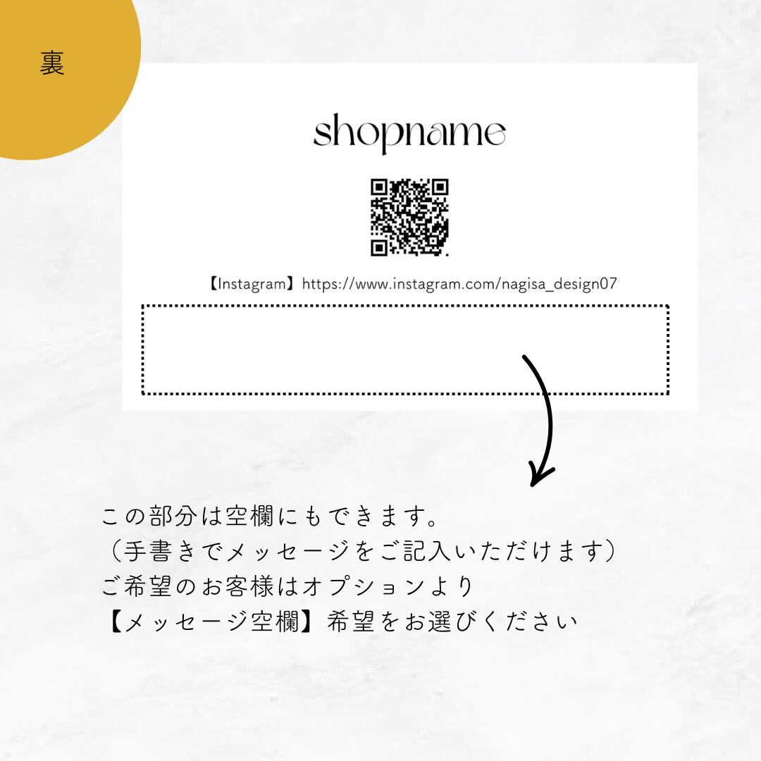 裏面部分も、QRコード・ショップ名・SNSアカウント・WebサイトURLなど、ご自身の情報を自由にカスタマイズできます。