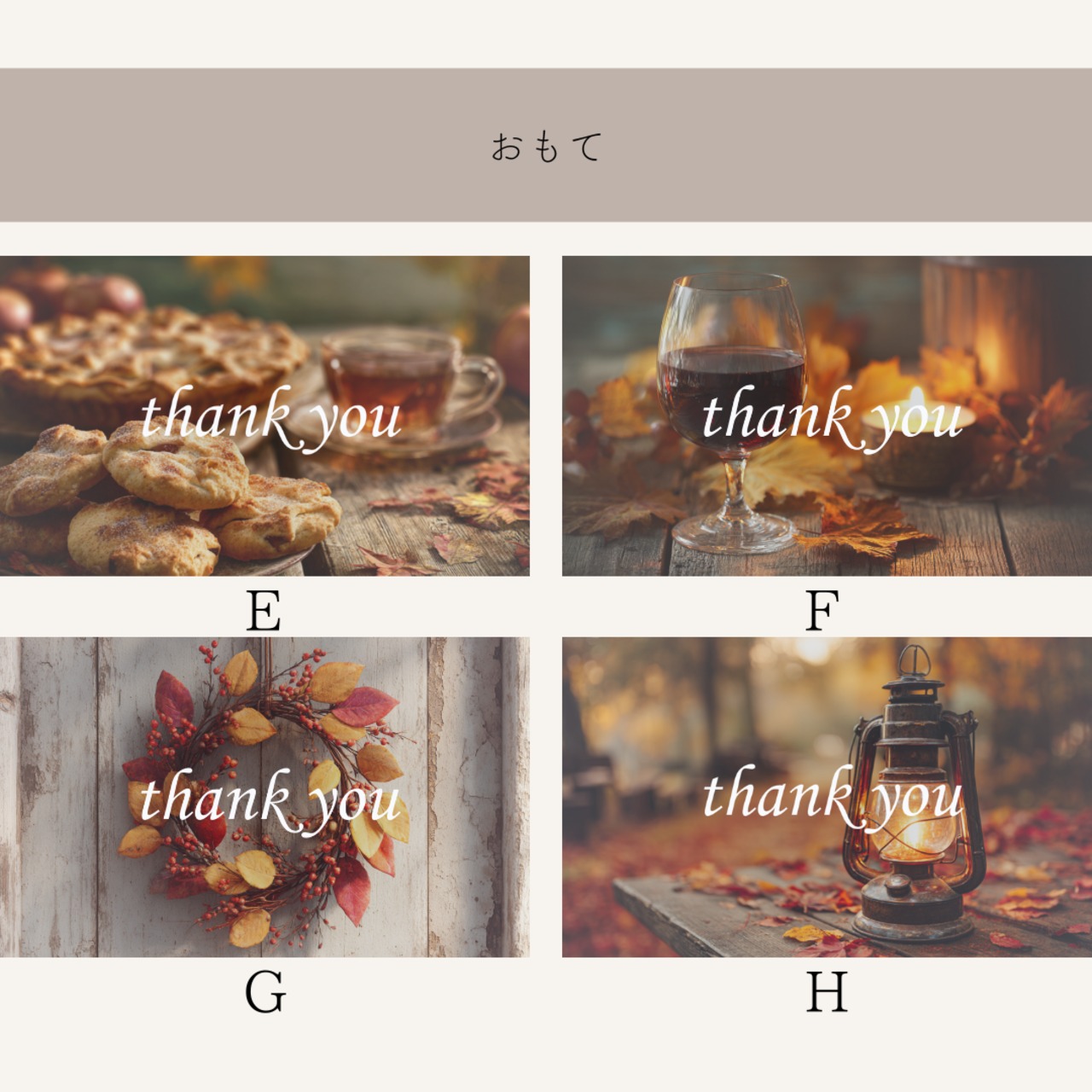 紅葉・ランタン・ワイン・リース・キャンドル・ボトル・お菓子・毛糸など、8種類のデザインからお選びいただけます。