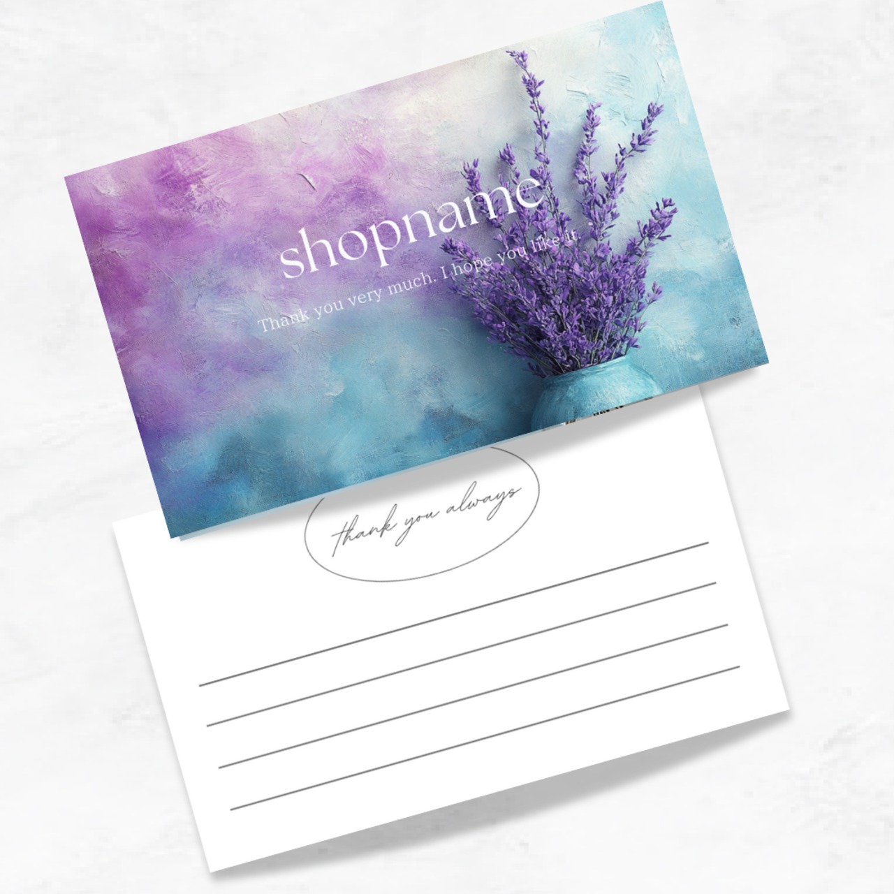 お客様へ感謝の気持ちを伝えるおしゃれ、ラベンダーが映えるなデザインのメッセージカードです。